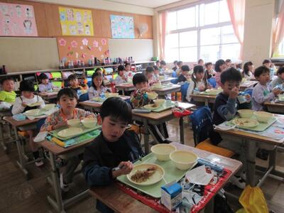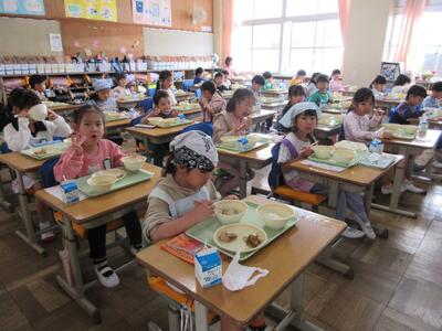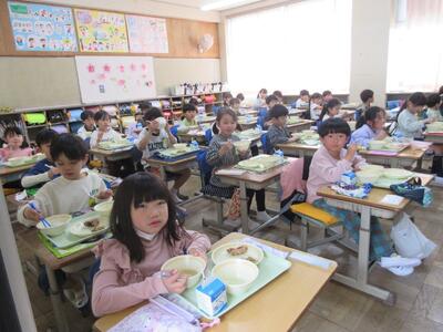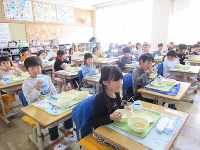 1年生にとっては、小学校生活で初めての給食です。配膳や食事の準備にも一生懸命取り組み、落ち着いた雰囲気の中で給食の時間を迎えることができました。